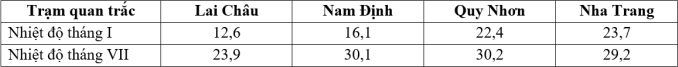 Cho bảng số liệu: NHIỆT ĐỘ TRUNG BÌNH THÁNG I VÀ THÁNG VII Ở MỘT SỐ TRẠM QUAN TRẮC Ở NƯỚC