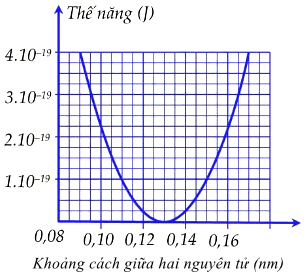Trong phân tử hydrochloric (HCl), nguyên tử chlorine (Cl) và nguyên tử hydrogen (H) có thể được coi là kết nối với nhau giống như có một lò xo nối giữa chúng. Vì khối lượng của nguyên tử chlorine lớn hơn nhiều so với khối lượng của nguyên tử hydrogen nên có thể coi gần đúng là nguyên tử chlorine đứng yên còn nguyên tử hydrogen dao động điều hòa quanh một vị trí cân bằng. Biết khối lượng nguyên tử hydrogen là 1,6.10-27 kg. Hình vẽ dưới biểu diễn thế năng tương tác giữa hai nguyên tử trong phân tử HCl. Số dao động mà nguyên tử hydrogen thực hiện được trong 2s là