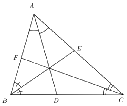 Cho \(\Delta ABC\) có ba đường phân giác AD, BE, CF. Biết \(AB = 4,BC = 5,CA = 6\). Tính BD, CE, AF.