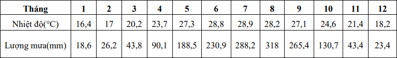 Cho bảng số liệu sau NHIỆT ĐỘ VÀ LƯỢNG MƯA TRUNG BÌNH THÁNG CỦA HÀ NỘI Biểu đồ thích