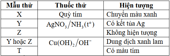 Tiến hành thí nghiệm với các dung dịch X, Y, Z, T. Kết quả được ghi ở bảng sau:Các chất X, Y,
