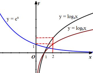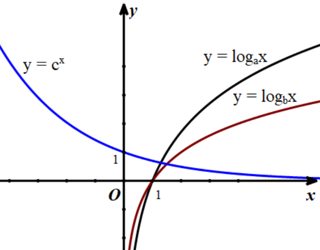 Cho ba số thực dương \(a,\,b,\,c\) khác \(1\). Đồ thị các hàm số \(y = {a^x},\,y = {\log _b}x\,\,,\,\,y