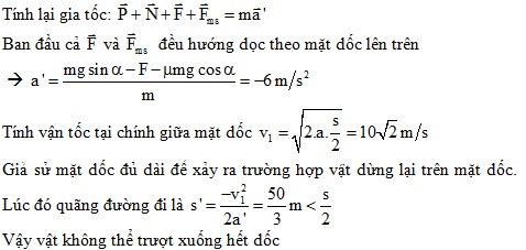 Một vật có khối lượng m = 5 kg, trượt xuống không vận tốc ban đầu từ đỉnh một dốc dài l = 50 m, cao h = 30m. Hệ số ma sát giữa vật và mặt dốc là μ = 0,25. Cho g = 10 m/s2.