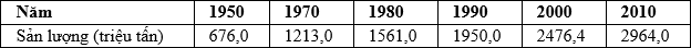 Cho bảng số liệu: SẢN LƯỢNG LƯƠNG THỰC CỦA THẾ GIỚI, THỜI KÌ 1950 - 2010 Theo bảng số
