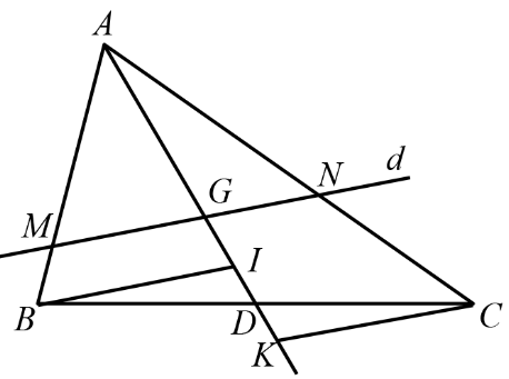 Cho tam giác ABC, D là điểm tuỳ ý trên cạnh BC. Đường thẳng \(d\) cắt các cạnh AB, AD, AC lần lượt tại M, G, N. Các đường thẳng BI, CK cùng song song với \(d\). Quan sát hình sau và sử dụng kí hiệu đồng dạng để viết ba cặp tam giác đồng dạng.