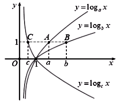 Đồ thị các hàm số \(y = {\rm{lo}}{{\rm{g}}_a}x,y = {\rm{lo}}{{\rm{g}}_b}x,y = {\rm{lo}}{{\rm{g}}_c}x\) lần lượt đi qua các điểm \(A\left( {a;1} \right)\), \(B\left( {b;1} \right),C\left( {c;1} \right)\). Từ đó so sánh a, b, c