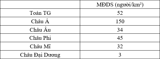 Từ bảng số liệu sau: Nhận xét nào sau đây về mật độ dân số của châu Đại Dương là
