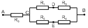 Cho mạch điện như Hình vẽ. Giá trị các điện trở: \({{\rm{R}}_1} = {{\rm{R}}_3} = 3\Omega ,{{\rm{R}}_2} = 2\Omega \), \({R_4} = 1\Omega ,{R_5} = 4\Omega \). Cường độ dòng điện chạy qua mạch chính là I = \(3\;{\rm{A}}\).