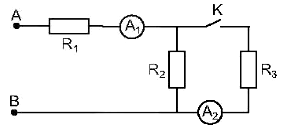 Cho mạch điện như Hình vẽ. Hiệu điện thế giữa hai đầu đoạn mạch \({\rm{AB}}\) là \({{\rm{U}}_{{\rm{AB}}}} = 6\;{\rm{V}}\). Khi \({\rm{K}}\) mở ampe kế \({{\rm{A}}_1}\) chỉ 1,2 A. Khi \({\rm{K}}\) đóng, ampe kế \({{\rm{A}}_1},\;{{\rm{A}}_2}\) chỉ lần lượt 1,4 A và \(0,5\;{\rm{A}}\). Bỏ qua điện trở của các ampe kế. Tính điện trở: \({R_1},{R_2},{R_3}\).