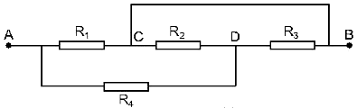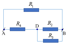 Cho đoạn mạch như Hình vẽ. Tính điện trở của đoạn mạch AB, biết các điện trở có giá trị bằng nhau và bằng \({\rm{R}}\). Biết dây nối có điện trở không đáng kể.