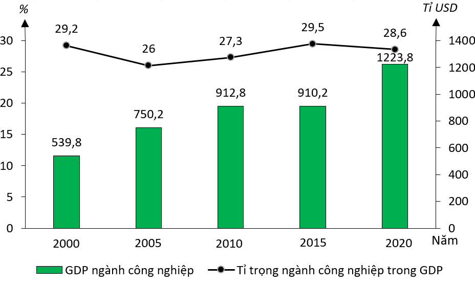 Cho bảng số liệu: GDP ngành công nghiệp và tỉ trọng ngành công nghiệp