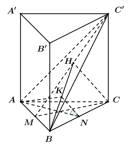 Gọi K là trung điểm của BH, chứng minh \(\left( {\left( {ABC'} \right),\left( {BCC'B'} \right)} \right) = \left( {AN,NK} \right)\).