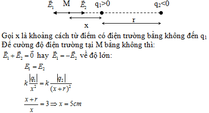 Hai điện tích điểm q1=10-9 C; q2= -9.10-9C, đặt cố định tại hai điểm A và B cách nhau 10cm trong chân không. Hãy tìm những điểm tại đó cường độ điện trường bằng không.