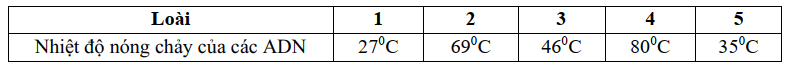 Nhiệt độ để phá vỡ các liên kết hiđrô và làm tách hai mạch của phân tử ADN mạch kép được gọi là nhiệt độ nóng chảy. Khi xét các đoạn phân tử ADN này có cùng chiều dài, người ta thu được kết quả thể hiện nhiệt độ nóng chảy của ADN trong nhân tế bào ở 5 sinh vật khác nhau: