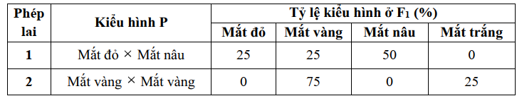 Biết rằng không xảy ra đột biến. Cho cá thể mắt đỏ ở (P) của phép lai 1 giao phối với cá thể mắt vàng ở (P) của phép lai 2. Theo lí thuyết, kiểu hình của đời con có thể là bao nhiêu?