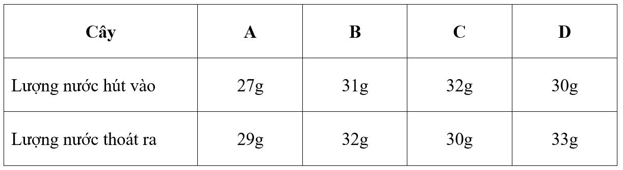 Trong một thí nghiệm, người ta xác định được lượng nước thoát ra và lượng nước hút vào của mỗi cây trong cùng một đơn vị thời gian như sau: