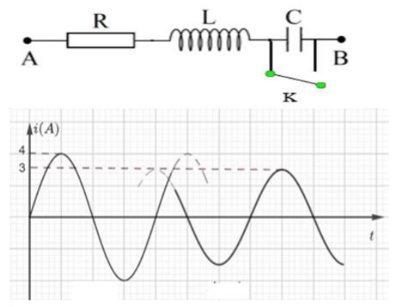 Điện áp xoay chiều \(u = {U_0}\cos \left( {100\pi t + \varphi } \right)\) vào hai đầu đoạn mạch AB gồm điện trở R, cuộn cảm thuần và tụ điện mắc nối tiếp. Hình bên là đồ thị biểu diễn sự phụ thuộc của cường độ dòng điện i trong đoạn mạch vào thời gian t khi khóa K đóng và mở. Giá trị của \(\varphi \) là