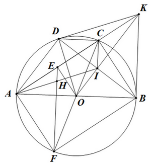 b) Biết \(OK\)cắt \(BD\) tại \(I.\) Chứng minh rằng \(OI \bot BD\) và \(KC \cdot KA = KI \cdot KO.\)