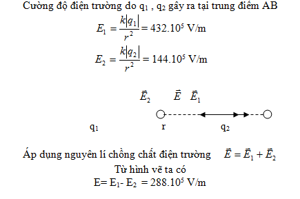 Cho hai điện tích q1= 12μC, q2= 4μC đặt cố định tại hai điểm A,B cách nhau 10cm trong chân không .Xác định cường độ điện trường tổng hợp tại trung điểm AB .