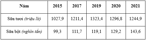 Cho bảng số liệu: SẢN LƯỢNG SỮA TƯƠI VÀ SỮA BỘT CỦA NƯỚC TA, GIAI ĐOẠN 2015 -