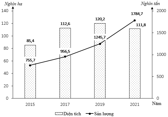 Cho biểu đồ về diện tích và sản lượng cam, quýt của nước ta, giai đoạn 2015 - 2021: