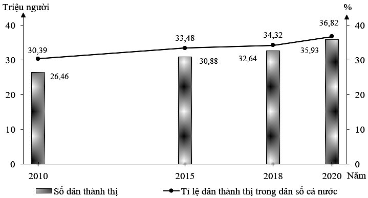 Cho biểu đồ về số dân thành thị và tỉ lệ dân thành thị nước ta giai đoạn 2010 - 2020: