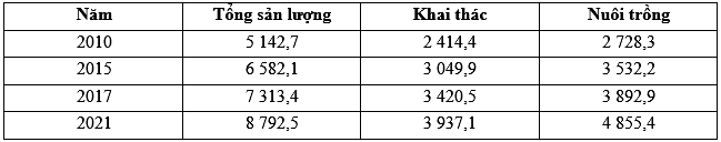 Cho bảng số liệu: SẢN LƯỢNG THỦY SẢN CỦA NƯỚC TA GIAI ĐOẠN 2010 - 2021 (Đơn vị: Nghìn