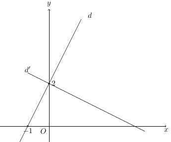 Cho đường thẳng \(y = ax + b\,\,\left( d \right)\) như hình vẽ. Đường thẳng \(y = cx + d\,\,\left( {d'} \right)\) cắt và vuông góc với đường thẳng \(d\) tại \(A\).