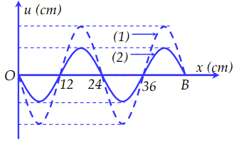 Trên một sợi dây OB căng ngang, hai đầu cố định đang có sóng dừng với tần số f xác định. Gọi M, N và P là ba điểm trên dây có vị trí cân bằng cách B lần lượt 4cm, 6cm và 38cm. Hình vẽ bên mô ta dạng sợi dây ở thời điểm t1 (đường 1) và thời điểm \({t_2} = {t_1} + \dfrac{{11}}{{12f}}\)(đường 2). Tại thời điểm t1, li độ của phần tử dây ở N bằng biên độ của phần tử dây ở M và tốc độ của phần tử dây ở M là 60 cm/s. Tại thời điểm t2, vận tốc của phần tử dây ở P là