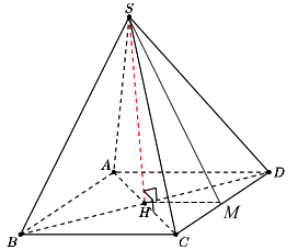 Cho hình chóp đều \(S.ABCD\) có cạnh đáy bằng \(a\sqrt 2 \) và đường cao \(SH\) bằng
