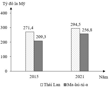 Theo biểu đồ, nhận xét nào sau đây đúng về sự thay đổi giá trị xuất khẩu năm 2021 so với năm 2015 của Thái Lan và Ma-lai-xi-a?