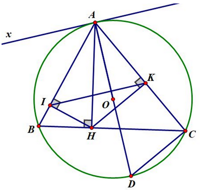 Cho tam giác \(ABC\) nhọn nội tiếp đường tròn tâm \(O\) bán kính \(R\) và đường cao \(AH\) \(\left( {H \in BC} \right)\). Kẻ \(HI,HK\) lần lượt vuông góc với \(AB,AC\left( {I \in AB,K \in AC} \right)\). Chứng minh: