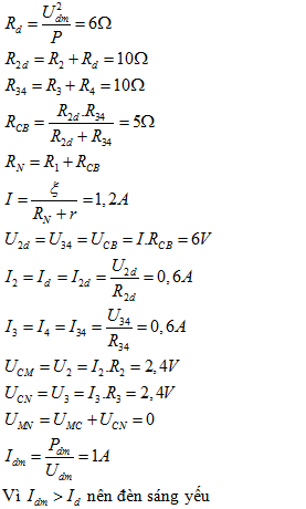 r=1 Ω , R1=R2= R3 =4Ω ; R3=6Ω; đèn Đ loại 6V - 6W .