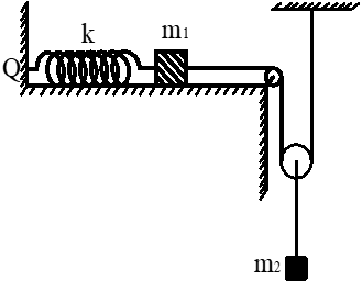 Cho cơ hệ như hình vẽ, biết \({m_1} = {m_2},\,\,k = 40\,\,N/m\). Từ vị trí cân bằng, nâng vật \({m_2}\) theo phương thẳng đứng đến vị trí lò xo không biến dạng rồi thả nhẹ lúc t = 0. Bỏ qua mọi ma sát, sợi dây không dãn, khối lượng của dây và các ròng rọc không đáng kể; lấy \(g = 10\,\,m/{s^2}\). Biết vật \({m_1}\) dao động điều hoà với chu kỳ \(\dfrac{\pi }{{2\sqrt 5 }}\,\,s\). Tại thời điểm \(t = \dfrac{{\sqrt 5 \pi }}{6}\,\,s\) thì lò xo kéo tường tường Q một lực có độ lớn
