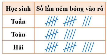 Thầy giáo kiểm tra kĩ năng ném bóng vào rổ của ba bạn Tuấn, Toàn, Hải và ghi lại kết quả