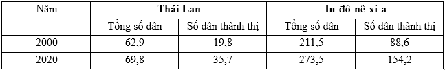 Cho bảng số liệu sau: TỔNG SỐ DÂN, SỐ DÂN THÀNH THỊ CỦA THÁI LAN VÀ IN-ĐÔ-NÊ-XI-A NĂM 2000 VÀ
