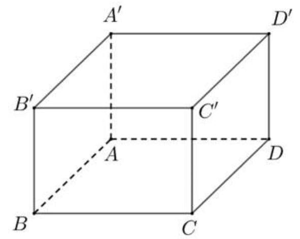 Cho hình hộp chữ nhật \(ABCD \cdot A'B'C'D'\) có \(AB = 1,BC = 2,AA' = 2\) (tham khảo hình