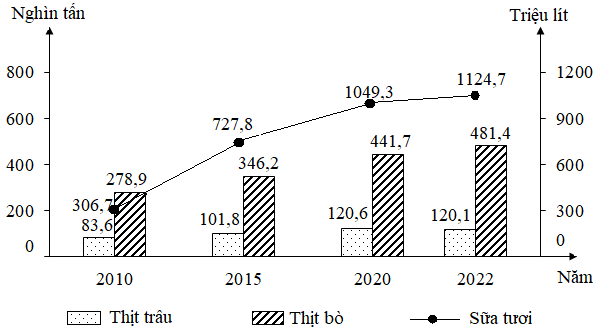 Cho biểu đồ về sản xuất một số nông sản của nước ta giai đoạn 2010 - 2022:
