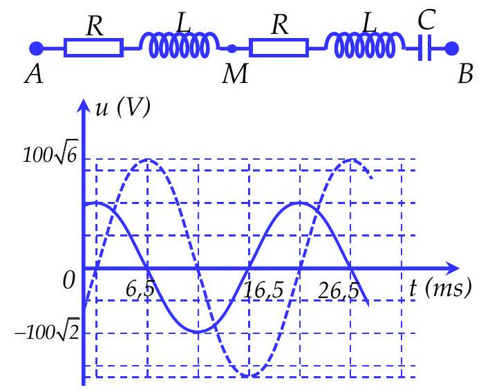 Đặt một điện áp xoay chiều có giá trị hiệu dụng U vào hai đầu đoạn mạch AB gồm hai điện trở giống nhau có giá trị R, hai cuộn cảm thuần giống nhau có độ tự cảm L và tụ điện có điện dung C mắc nối tiếp như hình bên. Đồ thị biểu diễn sự phụ thuộc theo thời gian của điện áp giữa hai đầu đoạn mạch AM và MB như hình bên. \({f_0}\) là tần số để có cộng hưởng điện trong đoạn mạch MB. \({f_0}\) có giá trị là