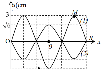 Một sợi dây đàn hồi AB căng ngang, hai đầu cố định đang có sóng dừng với tần số f = 2 Hz. Hình vẽ bên mô tả sợi dây tại thời điểm (đường 1) và thời điểm \({t_2} = {t_1} + \Delta t\) (đường 2), \(\Delta t = \dfrac{7}{{48}}\,\,s\). Khoảng cách lớn nhất giữa hai phần tử bụng sóng liền kề trong quá trình truyền sóng là