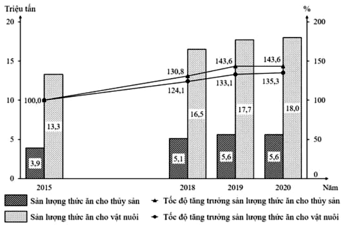 Cho biểu đồ về sản xuất thức ăn cho thủy sản và thức ăn cho vật nuôi của nước ta giai đoạn 2015 - 2020