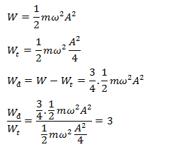 Trong dao động điều hòa của con lắc lò xo biên độ A. Tại thời điểm con lắc có li độ x = A/2 thì tỉ số giữa động năng và thế năng của con lắc là: