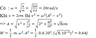 Con lắc lắc lò xo có m = 0,4kg ; k = 160 N/m dao động điều hòa theo phương thẳng đứng.biết khi vật có li độ 2 cm thì vật có vận tốc 40 cm/s. Năng lượng dao động của vật là