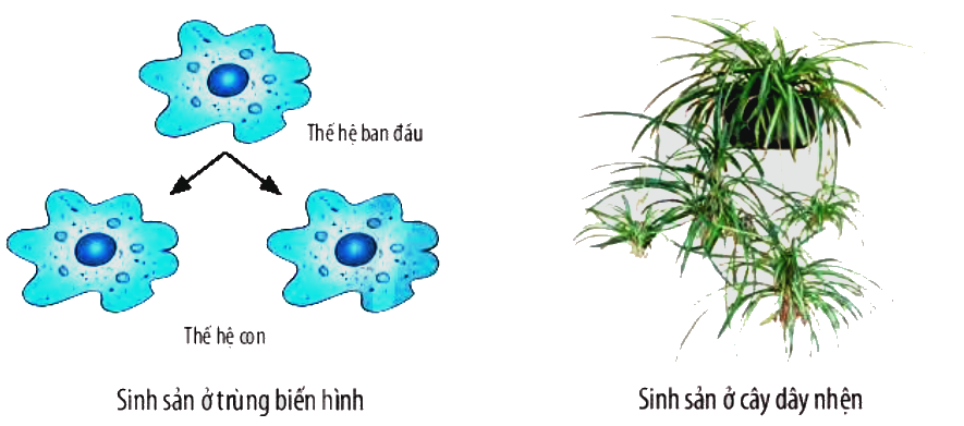 b) Quan sát (hv) hãy cho biết sinh sản ở cây dây nhện có điểm gì khác với sinh sản ở trùng biến hình.