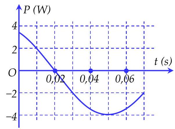 Một con lắc lò xo dao động điều hòa trên mặt phẳng nằm ngang. Công suất tức thời P của lực kéo về được xác định bởi tích của lực kéo về và vận tốc của vật. Hình bên là đồ thị biểu diễn sự phụ thuộc của P theo thời gian t. Tại thời điểm ban đầu t = 0, vật cách vị trí cân bằng 4 cm. Độ cứng của lò xo là