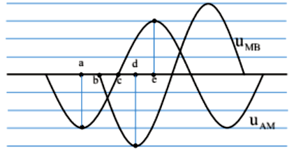 Một đoạn mạch xoay chiều AB gồm đoạn AM mắc nối tiếp với đoạn MB. Đoạn AM gồm điện trở thuần mắc nối tiếp với cuộn cảm thuần; đoạn MB chỉ có tụ điện. Dùng dao động kí điện tử để hiển thị đồng thời đồ thị điện áp giữa hai đầu đoạn AM và điện áp giữa hai đầu đoạn MB như hình vẽ. Biết khoảng cách giữa các điểm a – b, b – c, c – d, d – e là đều nhau. Hệ số công suất của đoạn mạch AB có giá trị gần nhất với giá trị nào sau đây?