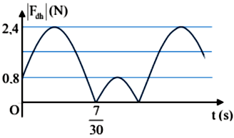 Một con lắc lò xo treo thẳng đứng đang dao động điều hòa. Hình bên là đồ thị mô tả sự phụ thuộc giữa độ lớn lực đàn hồi của lò xo \(\left| {{F_{dh}}} \right|\) theo thời gian t. Lấy g = π2 = 10m/s2. Mốc thế năng tại vị trí cân bằng. Cơ năng của con lắc là