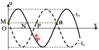 Một sóng cơ truyền dọc theo chiều dương trục Ox trên một sợi dây đàn hồi rất dài với tần số f. Tại thời điểm t1 và thời điểm t2, hình ảnh sợi dây có dạng như hình vẽ. Biết \(\dfrac{{MN}}{{MP}} = \dfrac{5}{7}.\) Đến thời điểm \({t_3} = {t_2} + \Delta t\) thì điểm P hạ xuống thấp nhất. Giá trị của Δt là