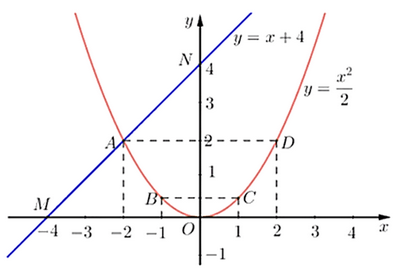 Cho parabol \(\left( P \right):y = \dfrac{{{x^2}}}{2}\) và đường thẳng \(\left( d \right):y = x + 4\).a) Vẽ