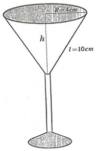 Bạn Nam dự định tổ chức buổi tiệc sinh nhật và chọn loại ly có phần chứa nước dạng hình nón với bán kính đáy \(R = 4{\rm{\;cm}}\) và độ dài đường sinh \(l = 10{\rm{\;cm}}\) để khách uống nước trái cây.